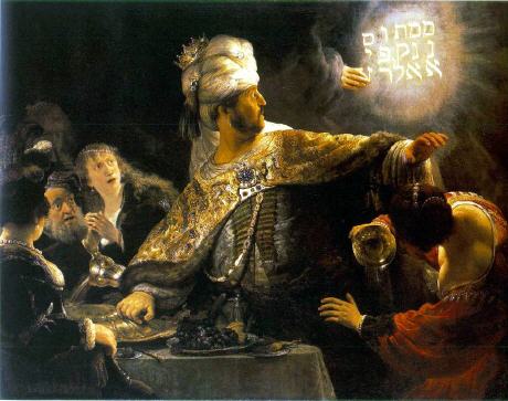 Die Erzählung über Belsazar stammt aus dem Alten Testament der Bibel, (Das Gastmahl des Belsazar, Daniel 5,25). Belsazar feierte ein rauschendes Fest, dabei verwendete er Gefäße, die sein Vater im Tempel von Jerusalem erbeutet hatte, als ihm eine geisterhafte Schrift an der Wand seines Palastes erschien. Er ließ sofort seine Schriftgelehrten herbeirufen, die sich aber als unfähig erwiesen, den Text zu entziffern. Daraufhin wurde der in Ketten gelegte Prophet Daniel herbeigeführt. Er las: „Mene mene tekel u-pharsin”, und deutete dies als Untergangs-Prophezeiung des Reiches Belsazars. Noch in der gleichen Nacht wurde Belsazar von seinen Knechten erschlagen.