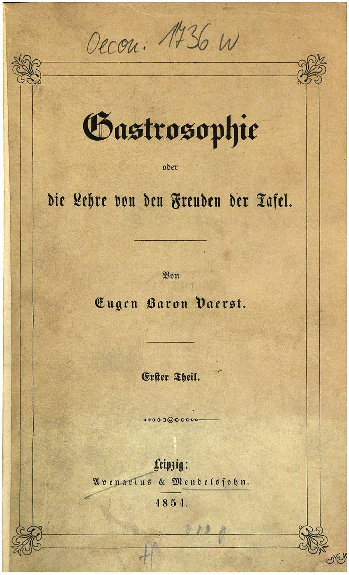 In seiner „Gastrosophie“ erhebt von Vaerst den Genuss von Speisen zu einer Kunstform und beschreibt die drei Arten von Feinschmeckern: den Gourmand, den Gourmet und den Gastrosophen; der Begriff „Gastrosophie“ wurde in diesem Buch erstmals in den deutschen Sprachgebrauch eingeführt. Der erste Band behandelt u. a. alle Arten von Speisen (Fleisch, Wild, Geflügel, Gemüse, Gewürze, Soßen, Fisch usw.), der zweite Band widmet sich u. a. den Getränken (Wasser, Wein, Kaffee, Tee und Bier) und beschreibt ein athenische Gelage.